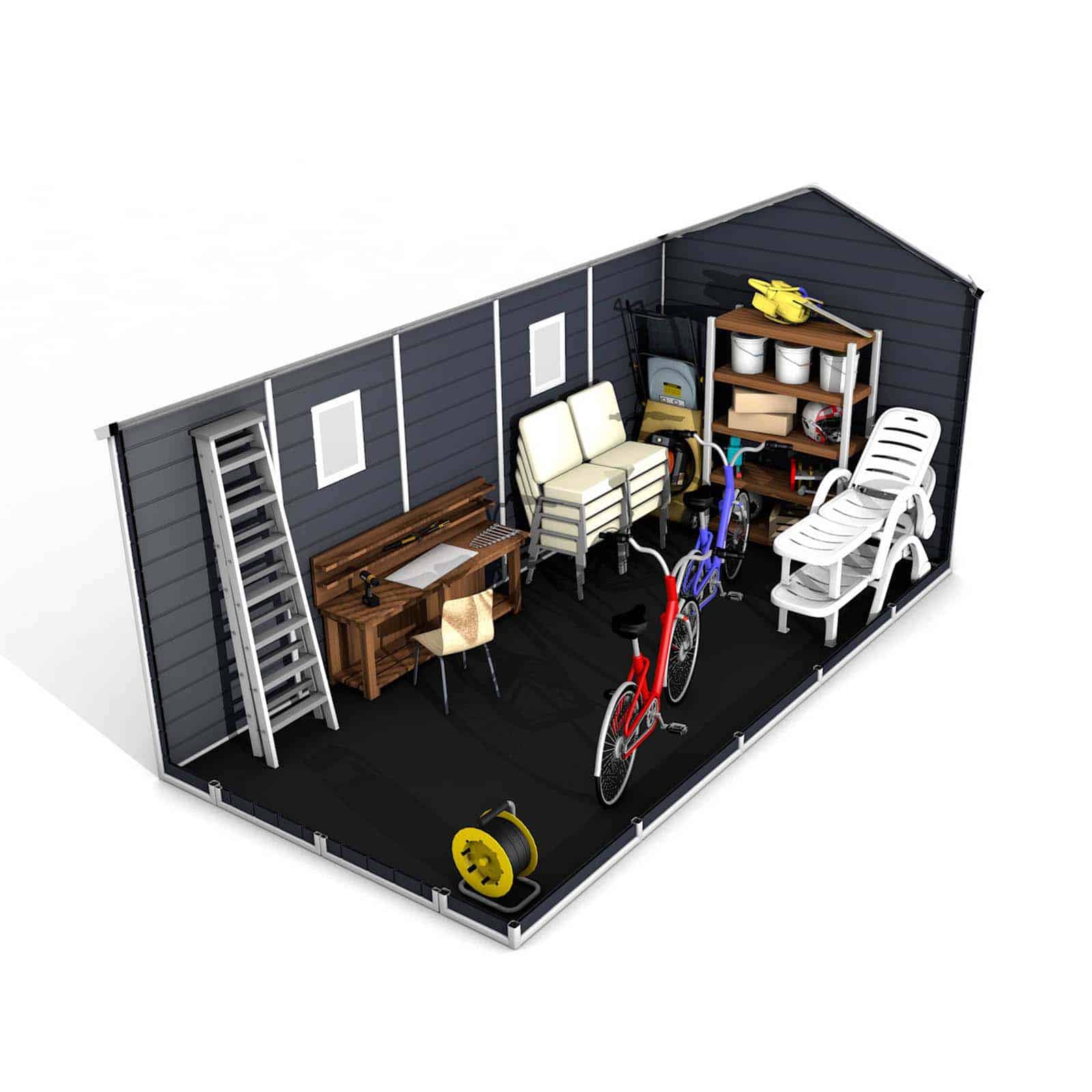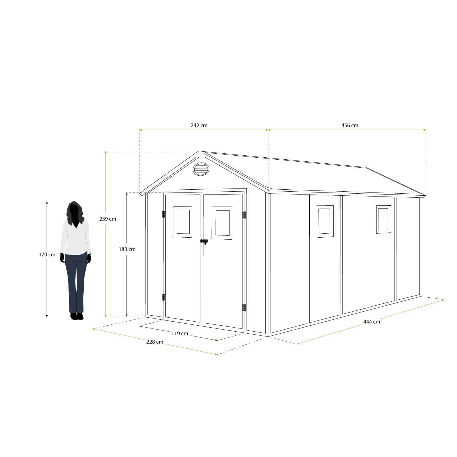 Abrigo em resina de polipropileno tubular (espessura da parede: 12 mm). A estrutura é reforçada com uma armação metálica de 1,5 mm de espessura para maior estabilidade. Tem um telhado de duas águas que evita de forma eficaz a acumulação da água da chuva. Para garantir a segurança dos seus objetos, a porta dupla articulada pode ser equipada com uma fechadura com cadeado (não incluído). O interior beneficia de luz natural graças às suas seis janelas em policarbonato, duas na porta e quatro nos lados, enquanto o respiro superior garante uma boa circulação do ar, evitando assim a formação de bolor e mofo. Uma caraterística importante deste abrigo é o chão incorporado de resina, que garante a proteção das suas ferramentas e máquinas contra a humidade direta do solo.