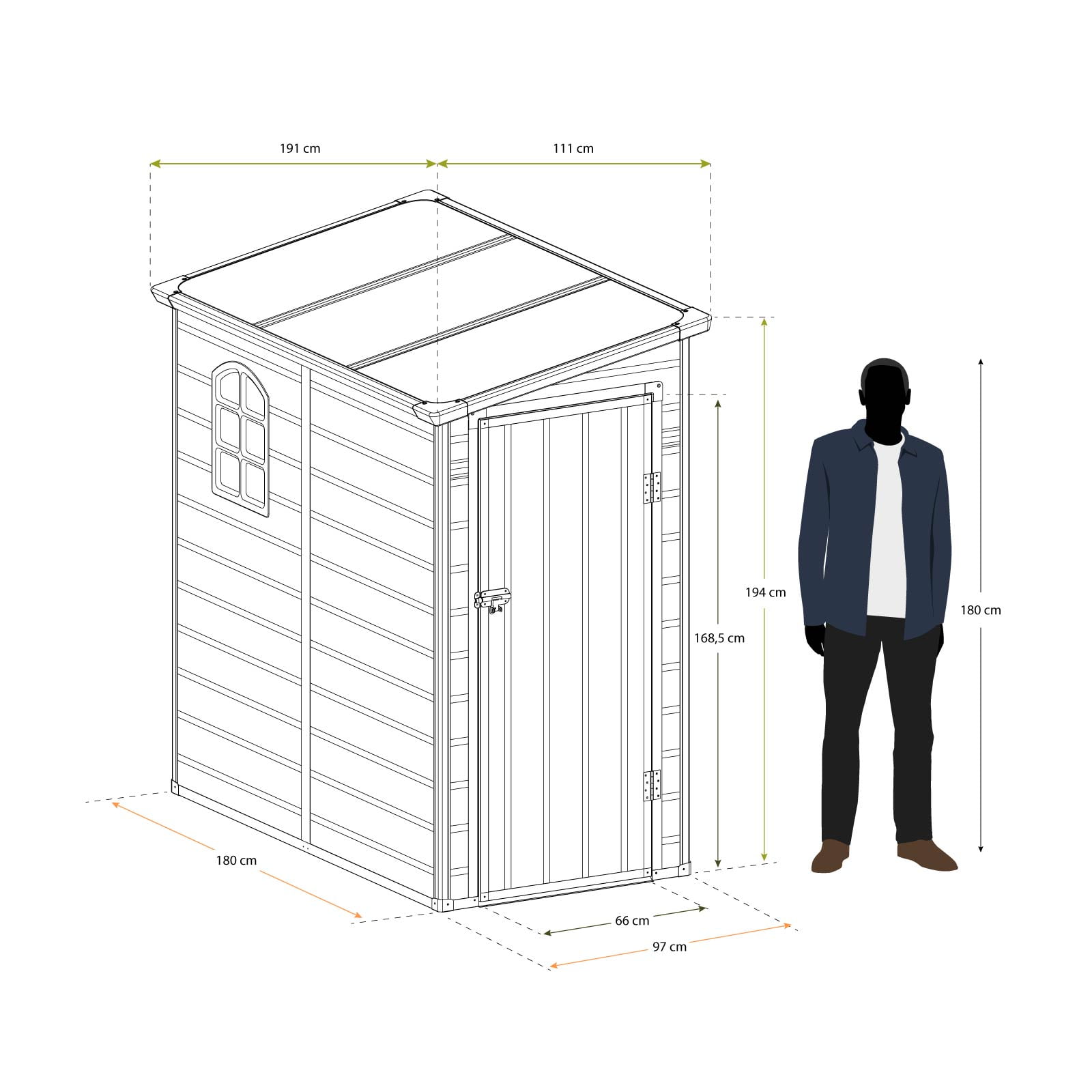 Abrigo em resina de polipropileno tubular (espessura da parede: 12 mm). Estrutura interna reforçada. Telhado plano com drenagem de água. Janela sólida em policarbonato. Porta com fechadura (cadeado não incluído). Não tem chão.