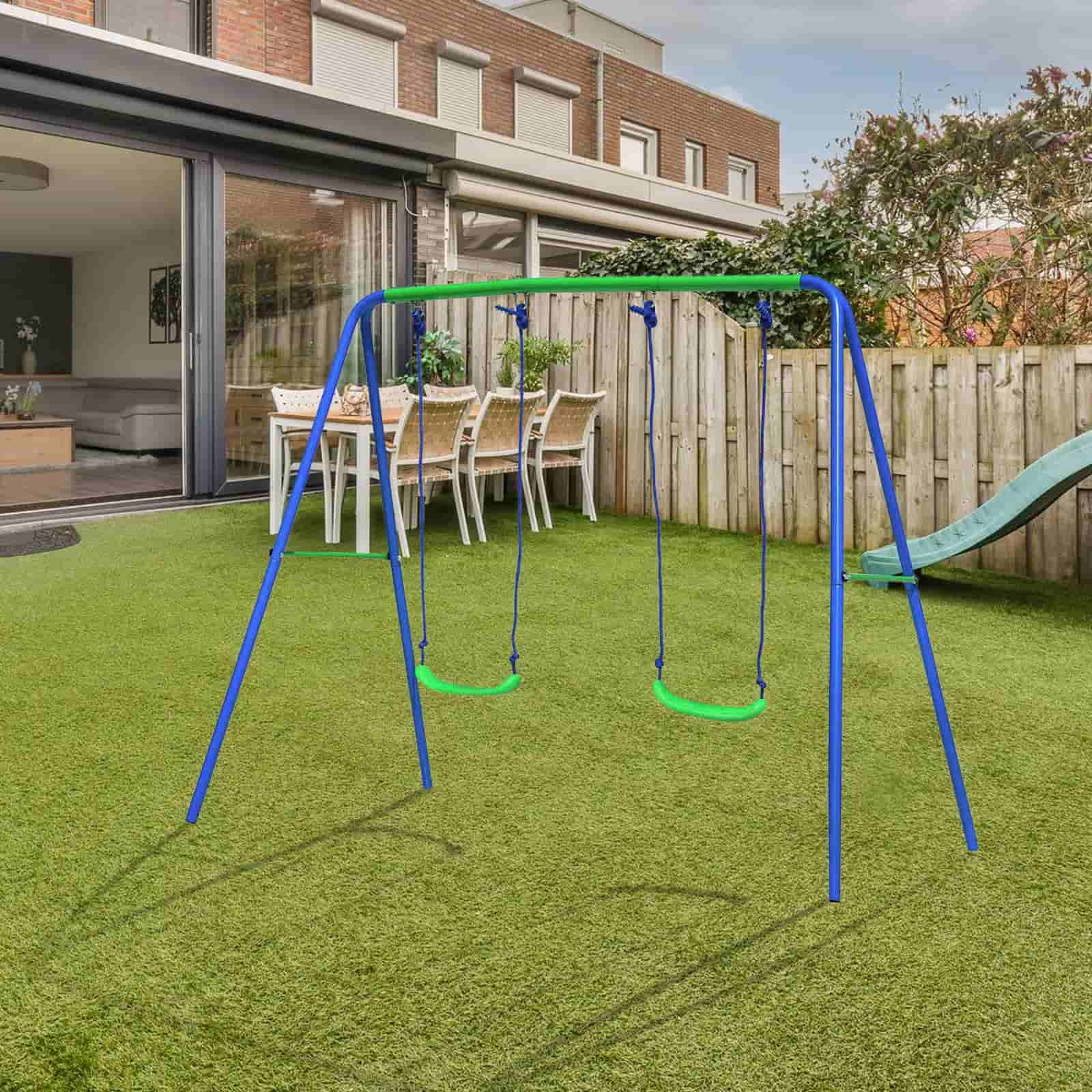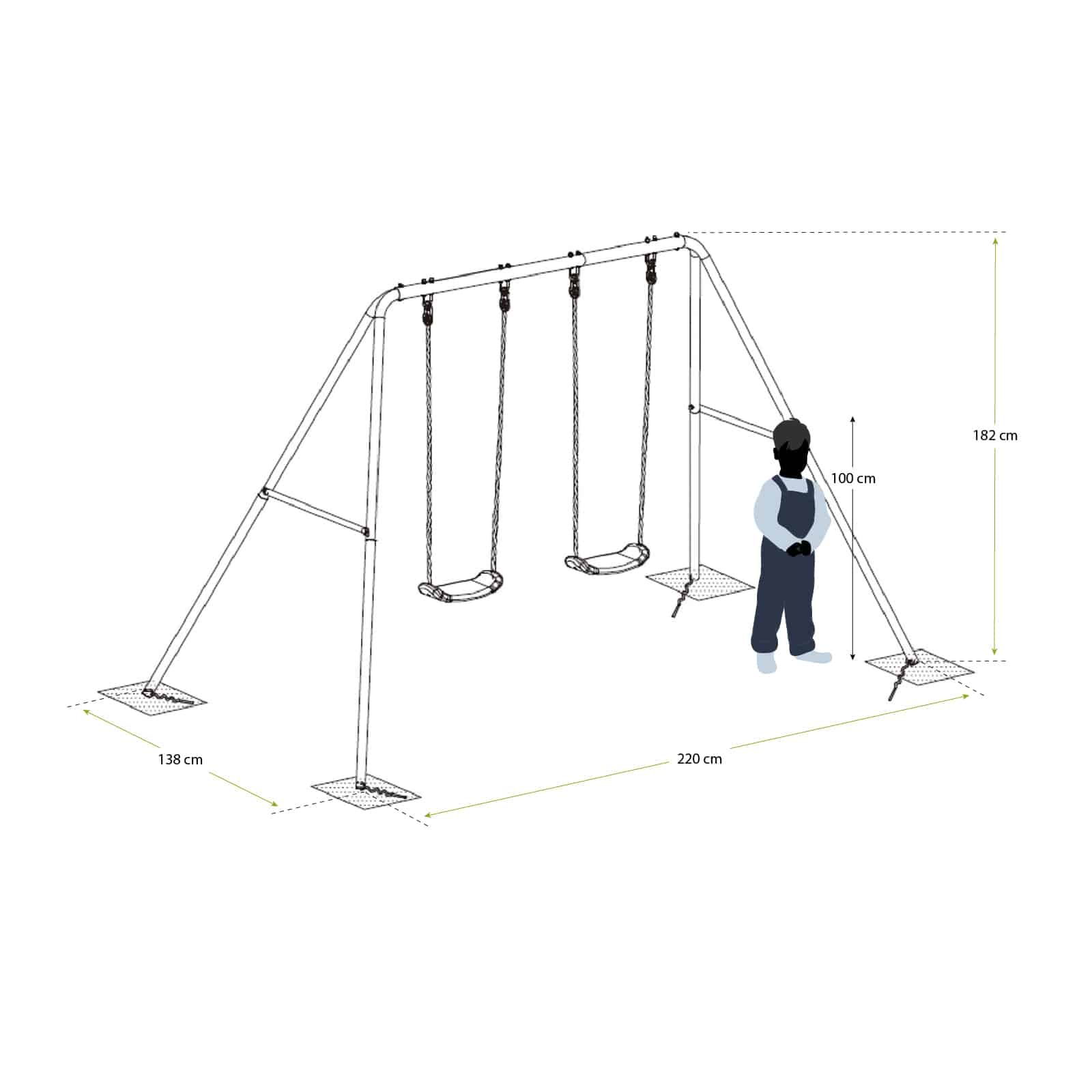 Balanço infantil exterior, marca OUTDOOR TOYS. Estrutura metálica lacada e assentos de PVC. Espaço recomendado: 18 m². Peso máximo por assento: 45 kg. Para 2 crianças. Com Certificado Europeu EN71 em segurança de brinquedos. Idade recomendada: 3-8 anos.